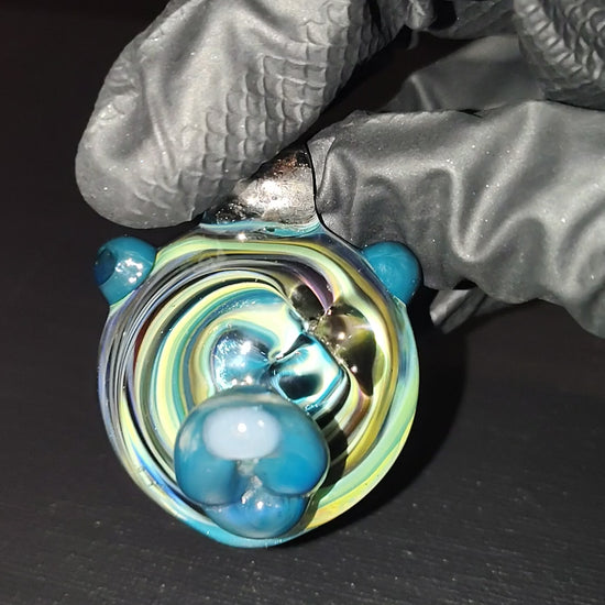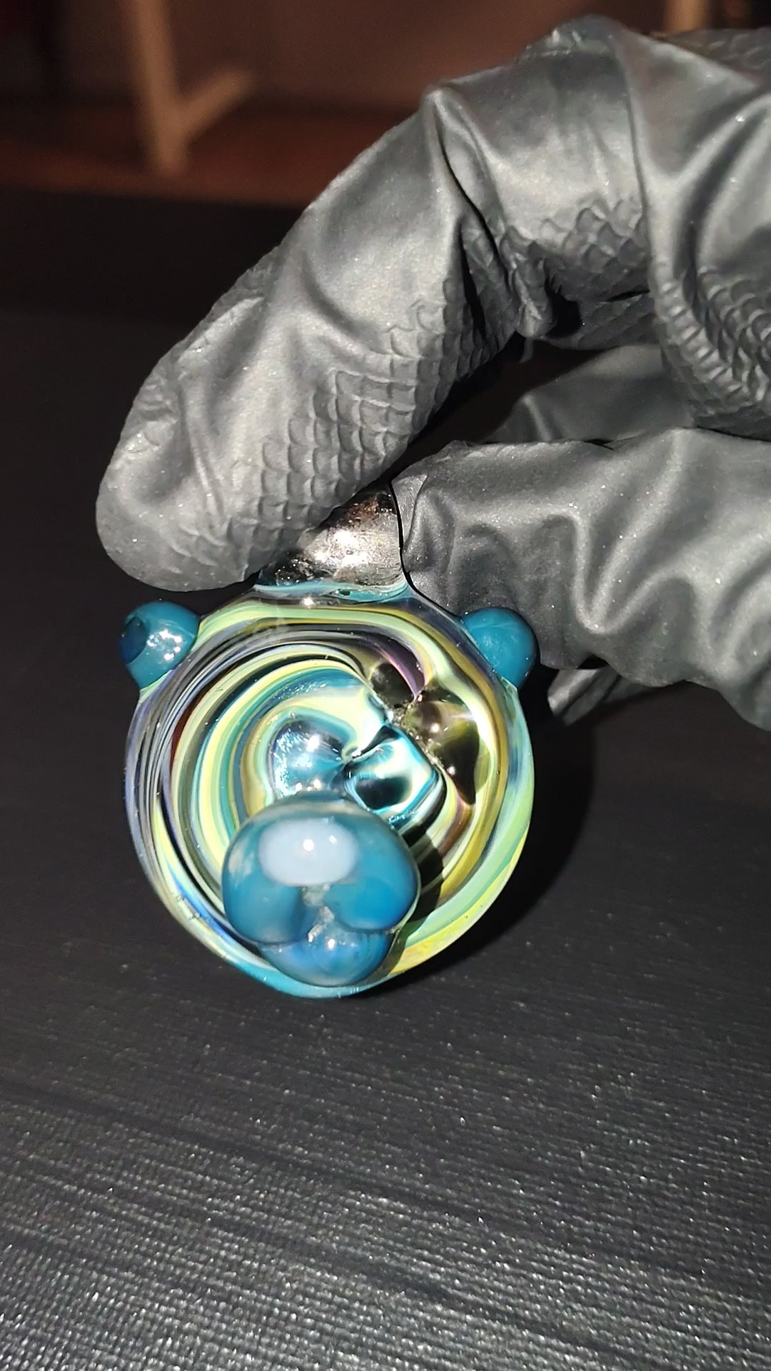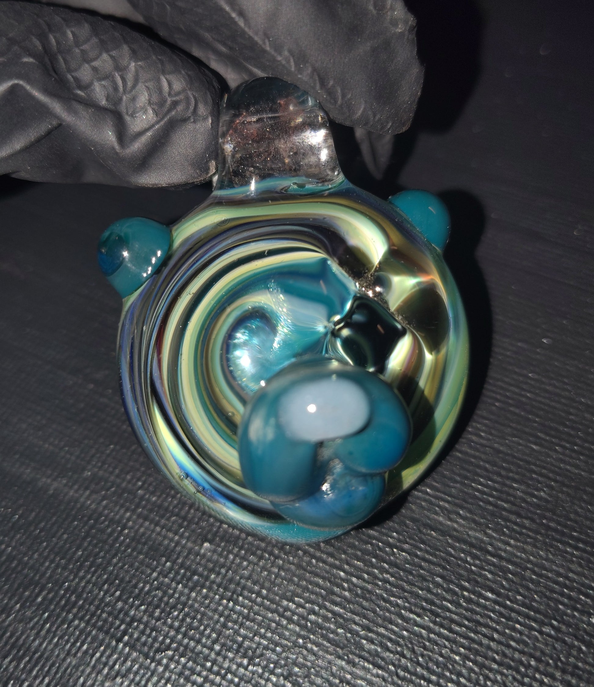 Borosilicate bear glass pendant with a unique vortex design on the face. Hand made by Blind Bear.