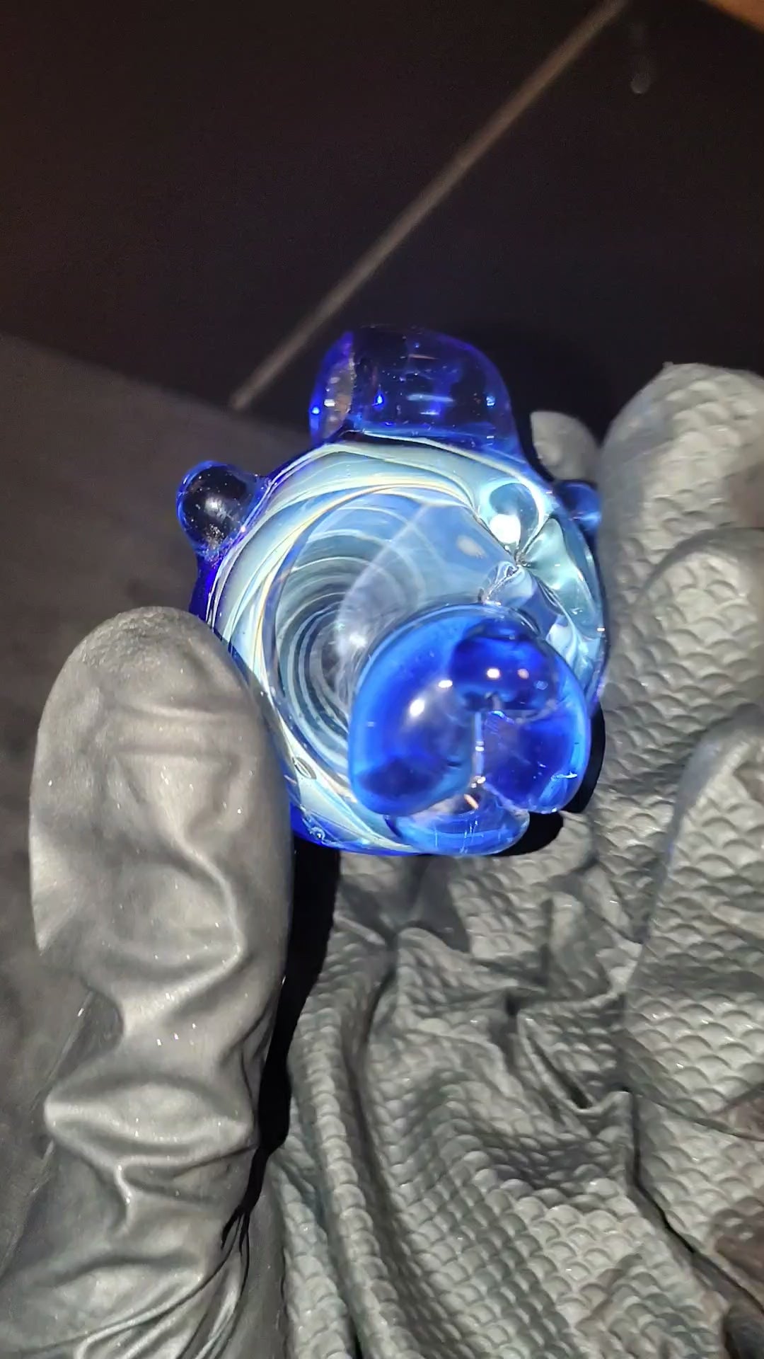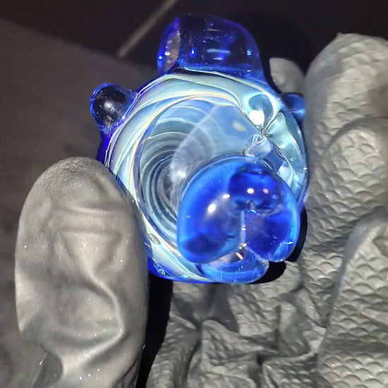 Borosilicate bear glass pendant with a unique pinwheel vortex. Hand made by Blind Bear.